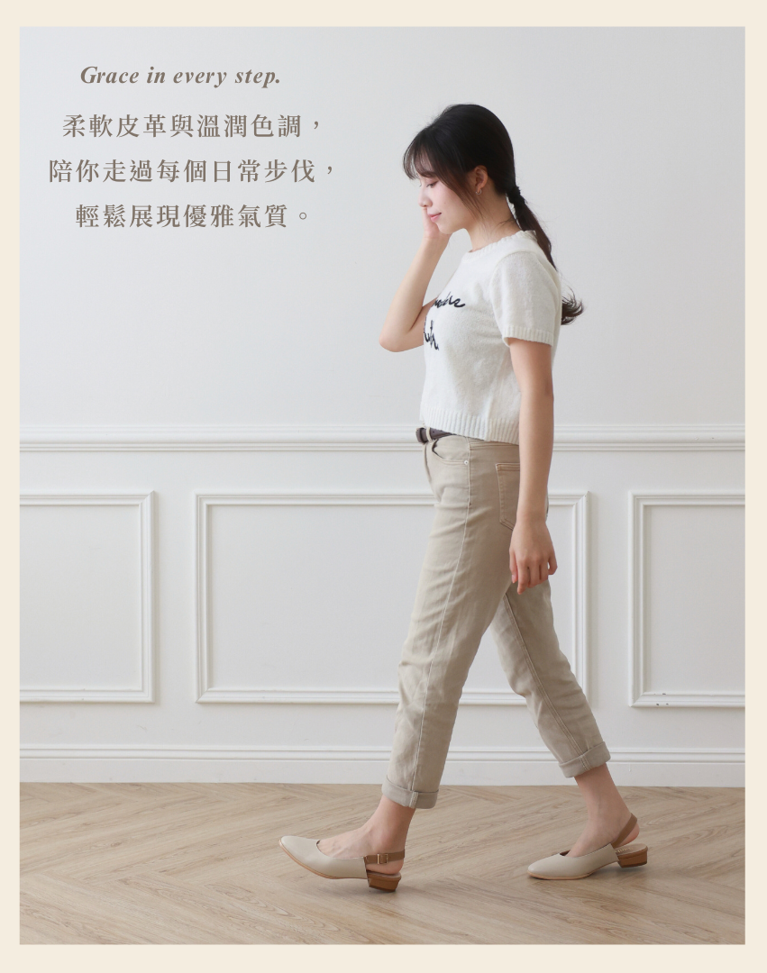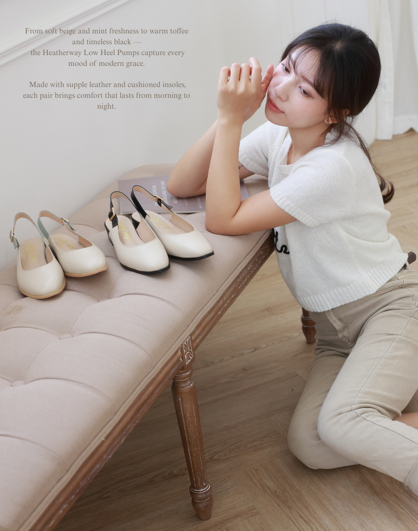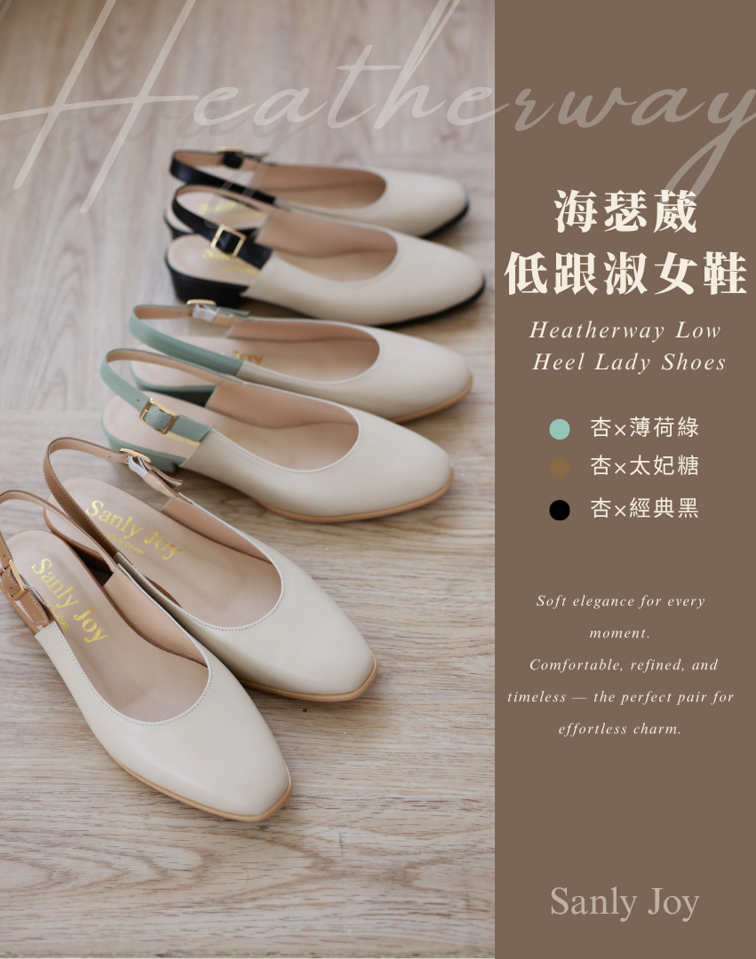 海瑟葳低跟淑女鞋,專為長時間穿著設計。以柔軟真皮製成,結合氣墊中底與3.5公分穩定粗跟,行走不壓迫。後帶採四孔調節,能依腳型微調貼合度。三色選擇:杏綠、杏棕、杏黑,從日常通勤到正式場合都能優雅著用,展現台灣製鞋的細膩工藝與舒適美學。