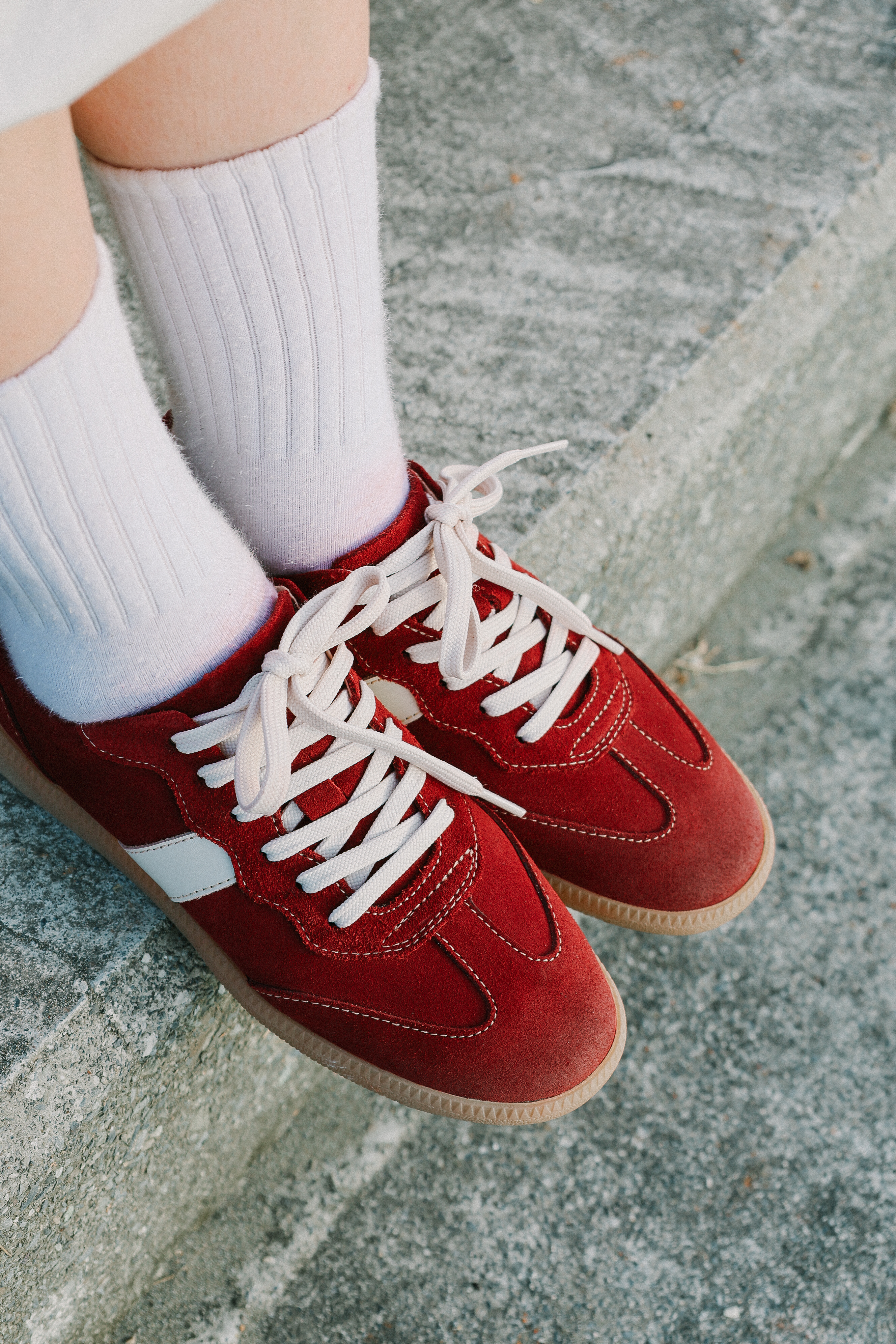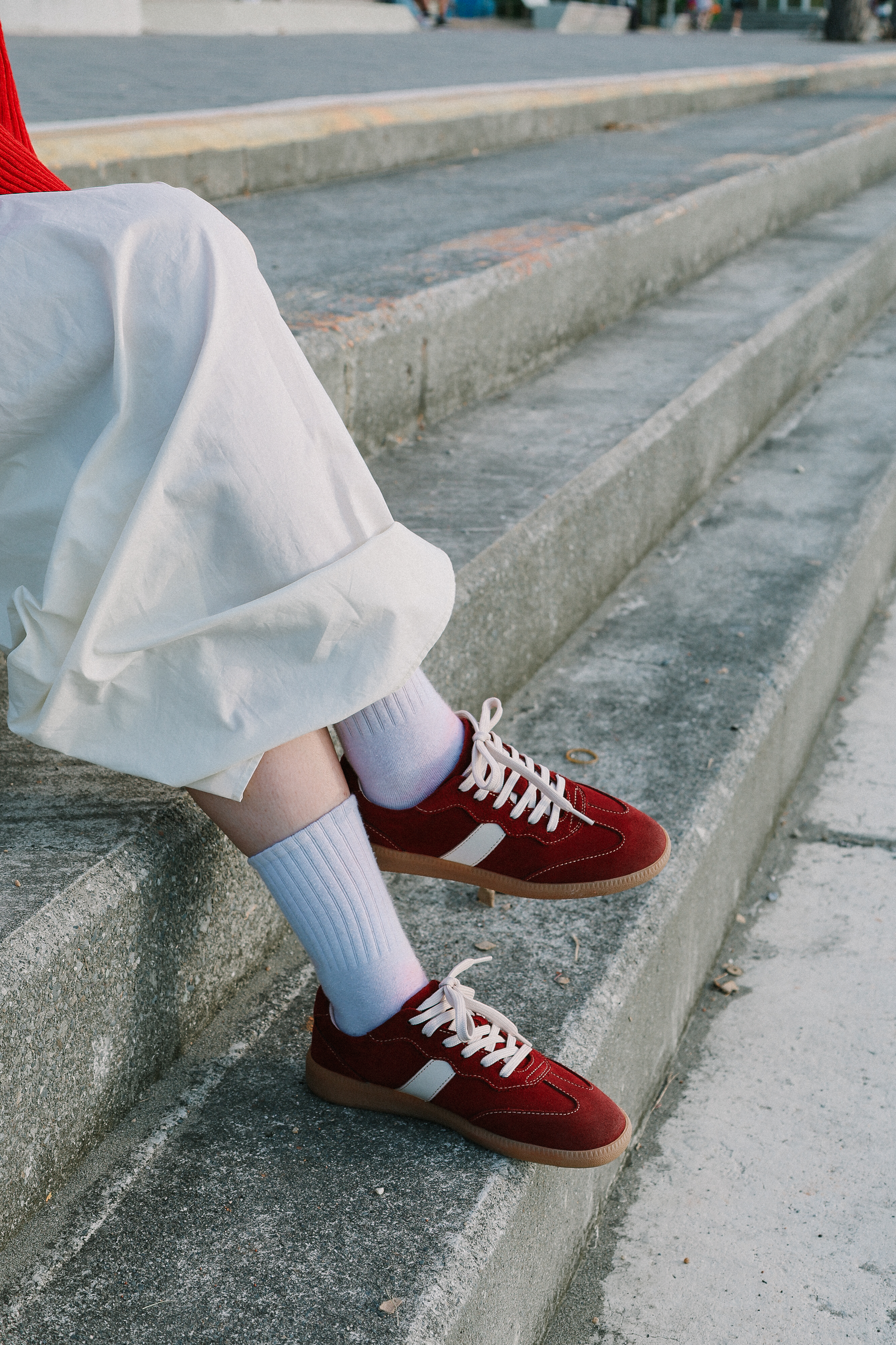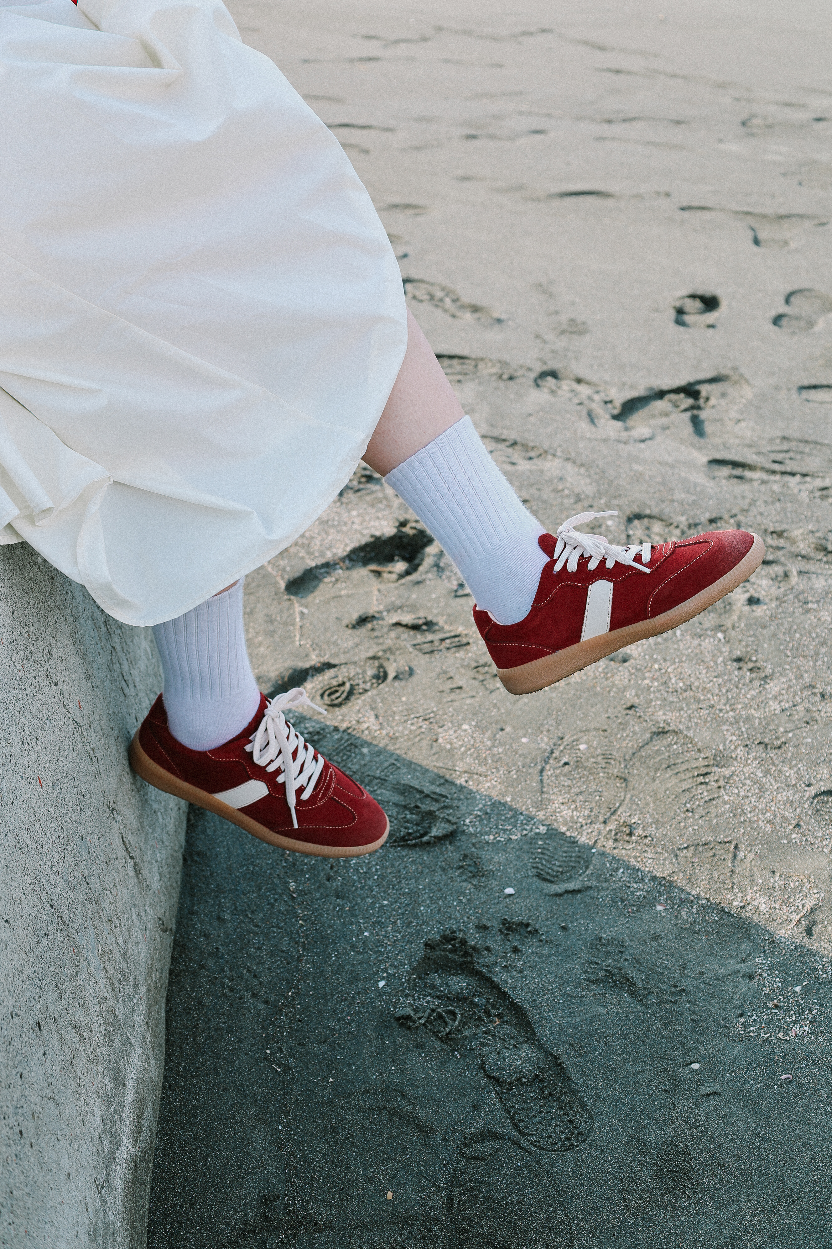 紅色德訓鞋,是 Sanly Joy 經典款中最亮眼的存在。鞋面採用防潑水麂皮與牛皮拼接,在保留德訓鞋俐落線條的同時,更增添層次與質感。台灣製作的鞋底穩固耐走,久穿不咬腳。從上班到假日、從街頭到海邊,都能展現率性與優雅並存的穿搭風格。紅色調低飽和不刺眼,襯托膚色又讓整體造型更有精神。這雙鞋不只是造型單品,更是每一步都舒適的日常夥伴。